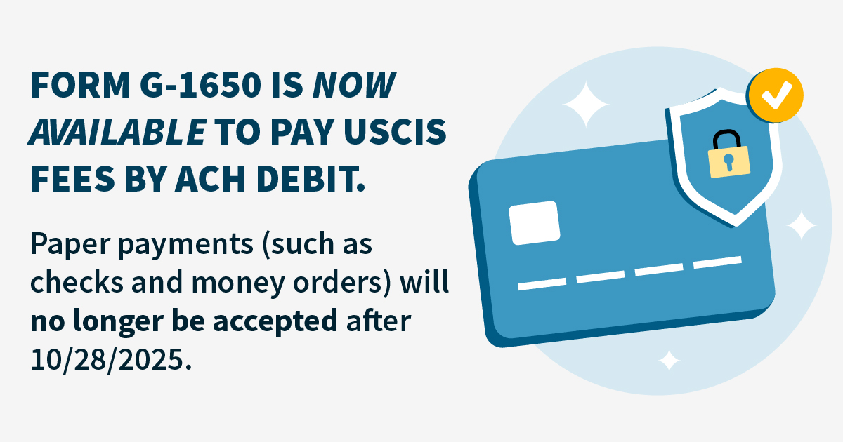 L’USCIS continuera d’accepter les paiements par chèque papier et par mandat-poste en plus des paiements de crédit et de débit jusqu’au 28 octobre 2025. Après le 28 octobre, l’USCIS acceptera seulement Transactions de débit ACH à l’aide du formulaire G-1650 ou paiements par carte de crédit à l’aide du formulaire G-1450.