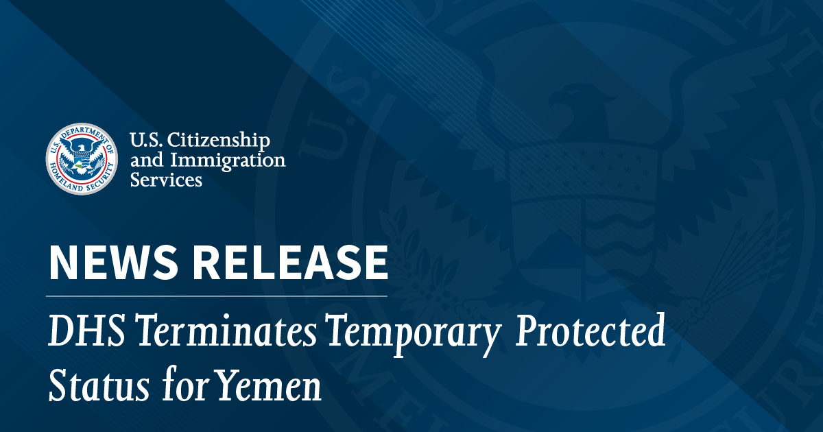 WASHINGTON – La secrétaire à la Sécurité intérieure, Kristi Noem, a annoncé aujourd’hui la fin du statut de protection temporaire du Yémen. La résiliation prend effet 60 jours après la publication de l’avis au Federal Register.