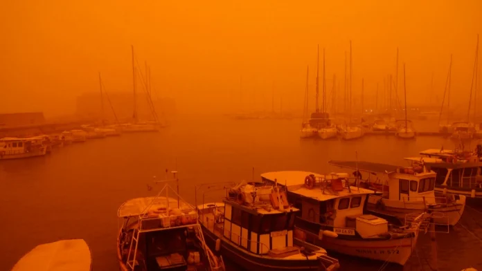La poussière saharienne venue d’Afrique du Nord a englouti le ciel de Crète dans une brume orange alors qu’elle dérivait sur la Méditerranée, perturbant la visibilité et affectant les vols vers l’île.